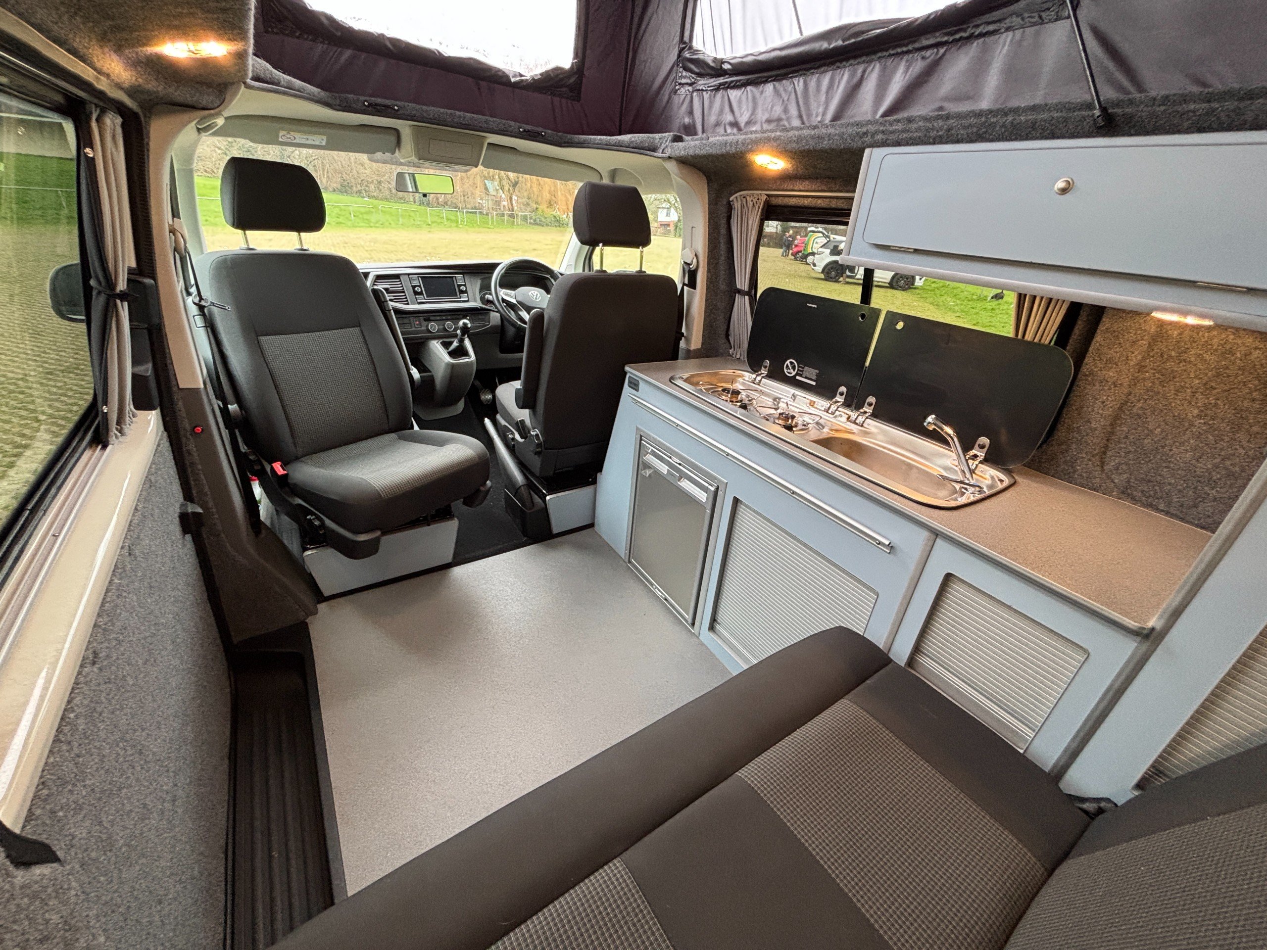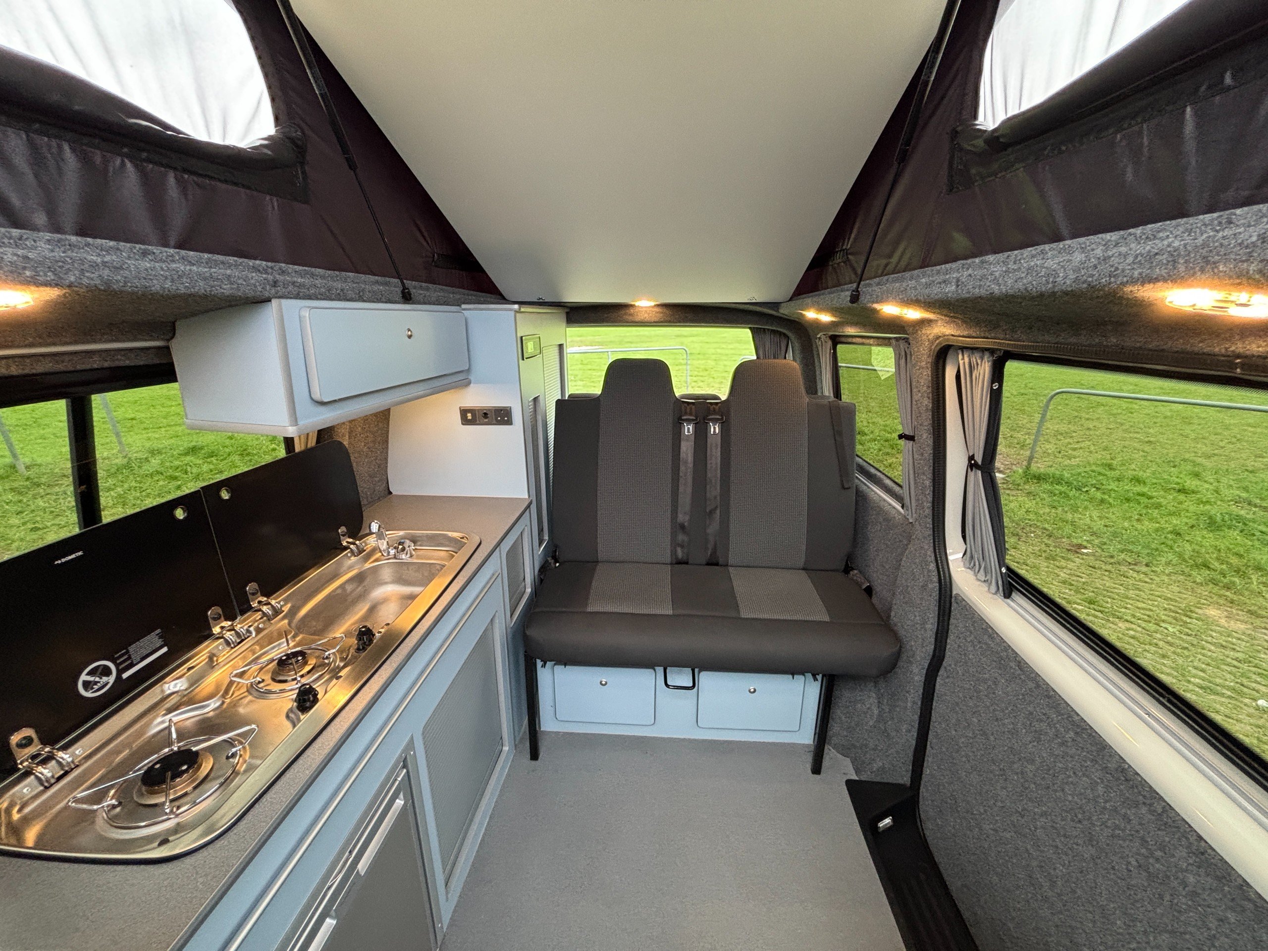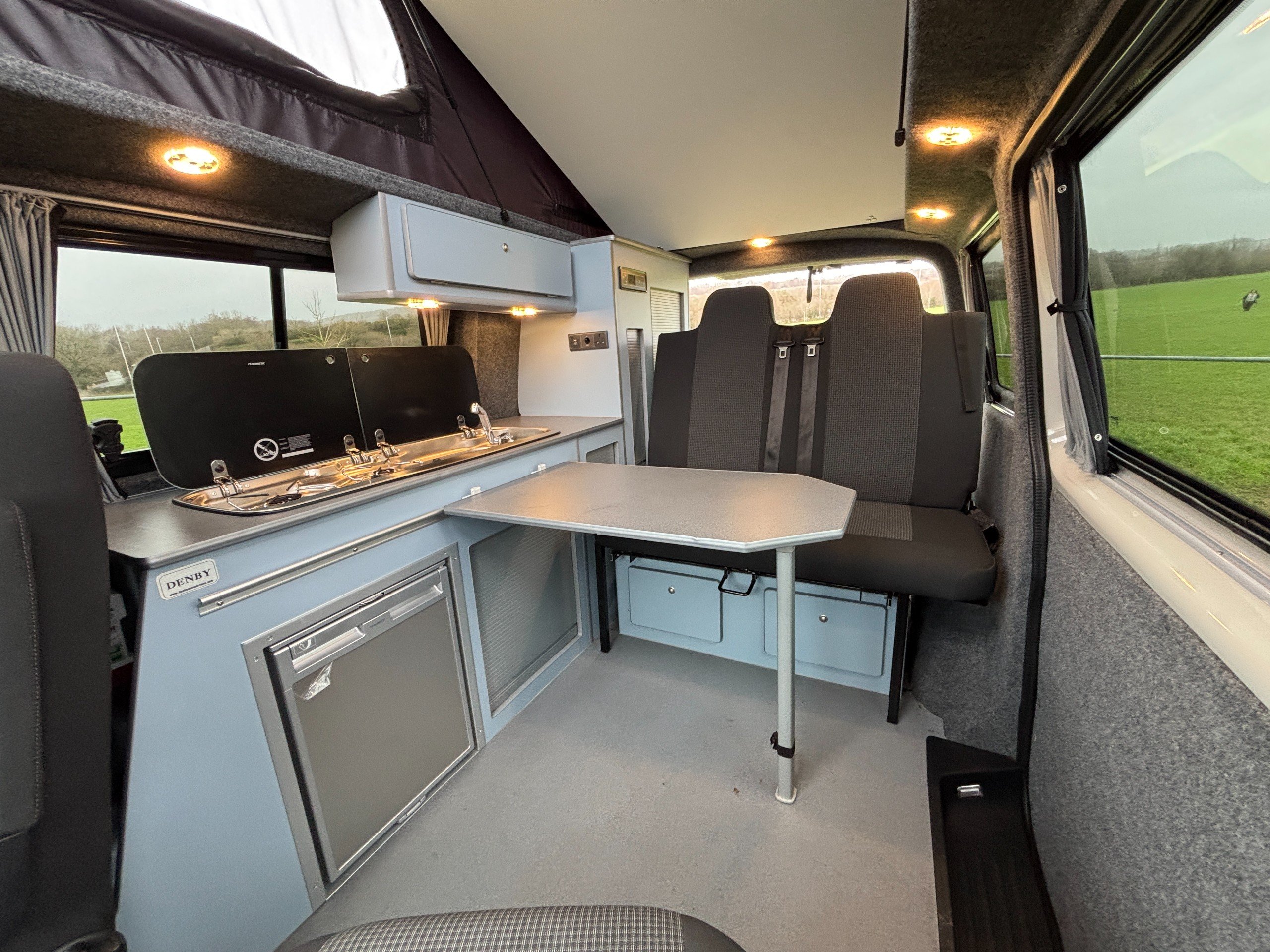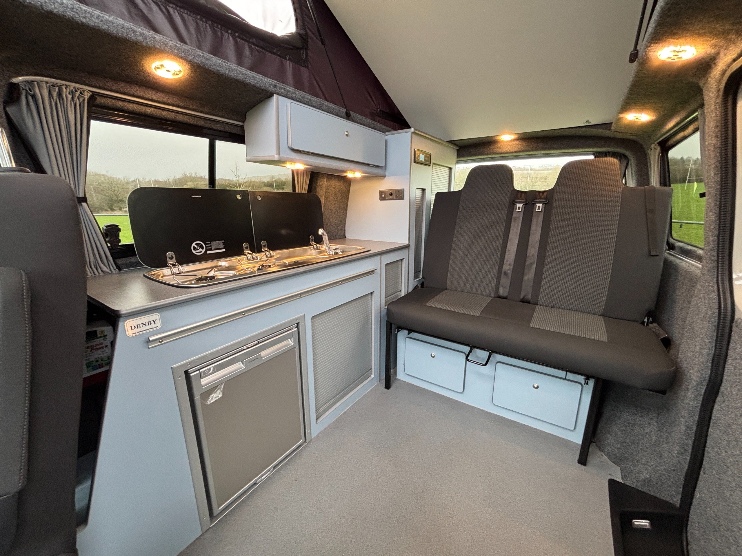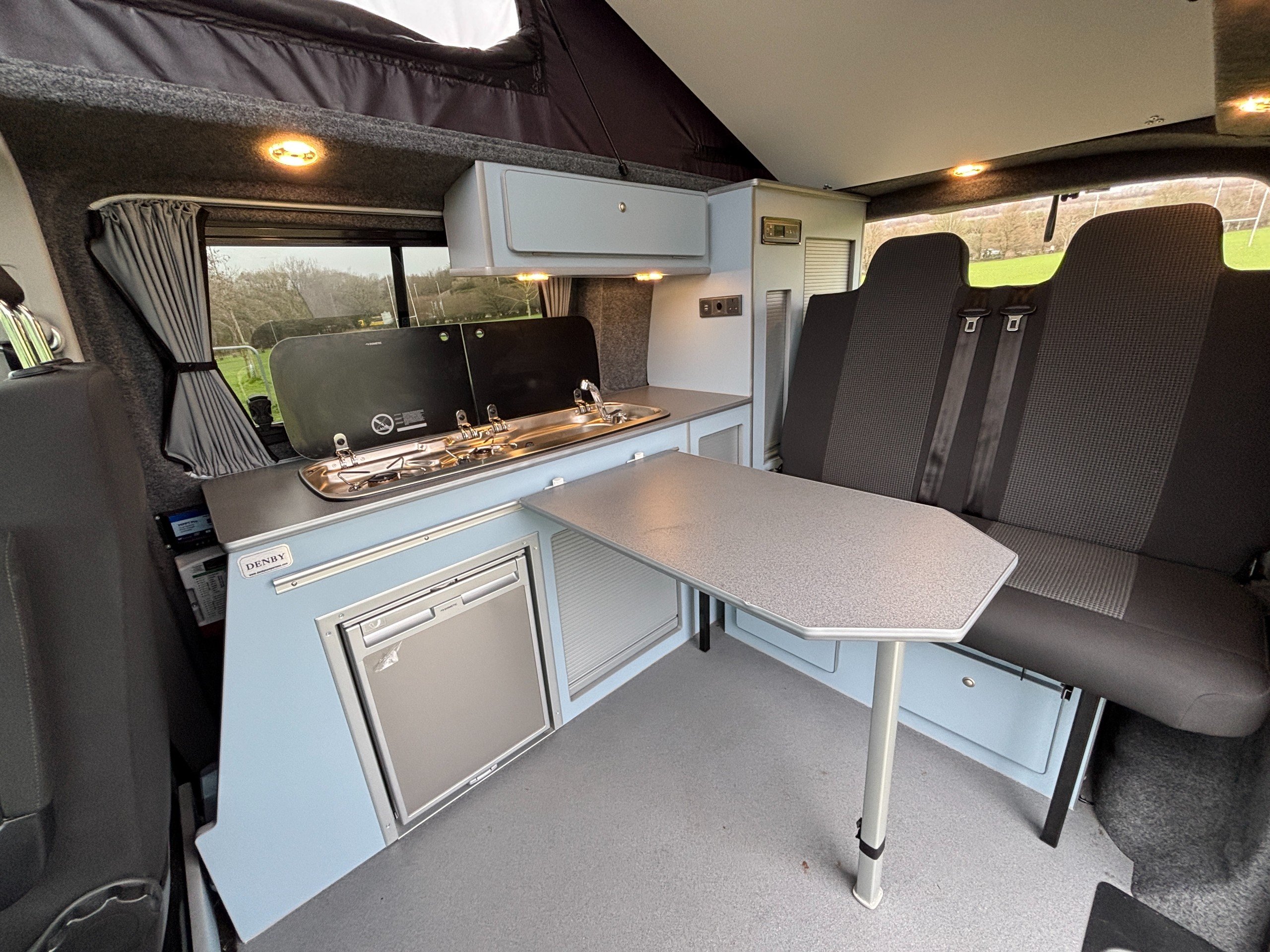 Professionally converted by Denby campervans, this is the popular Balmoral conversion. A fully converted campervan with a pop top roof. Sleeping 4, with 4 Traveling seats.