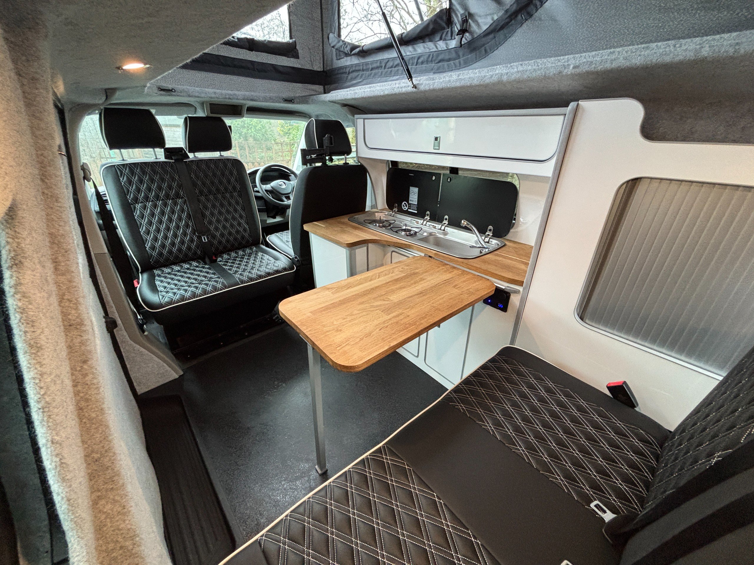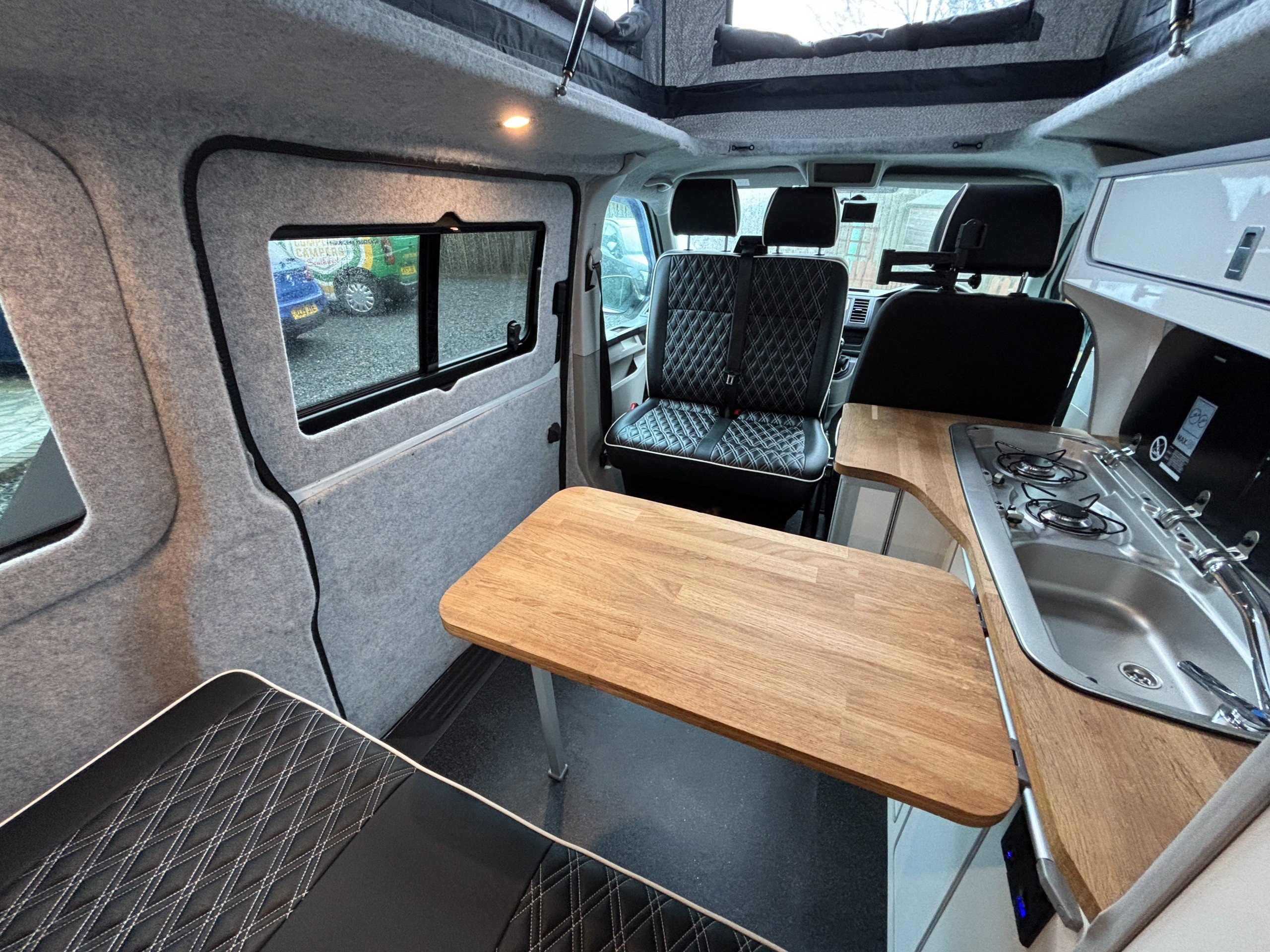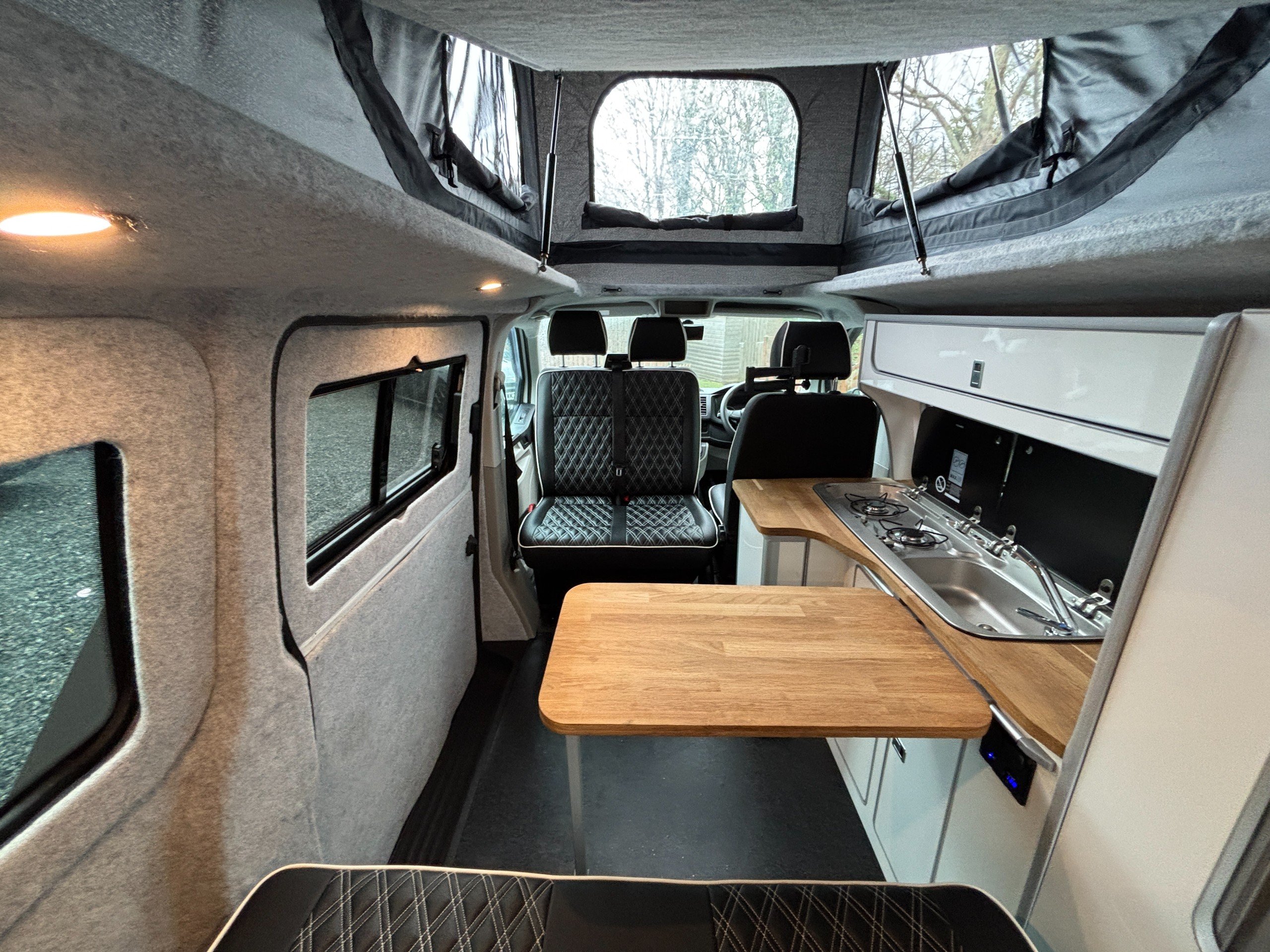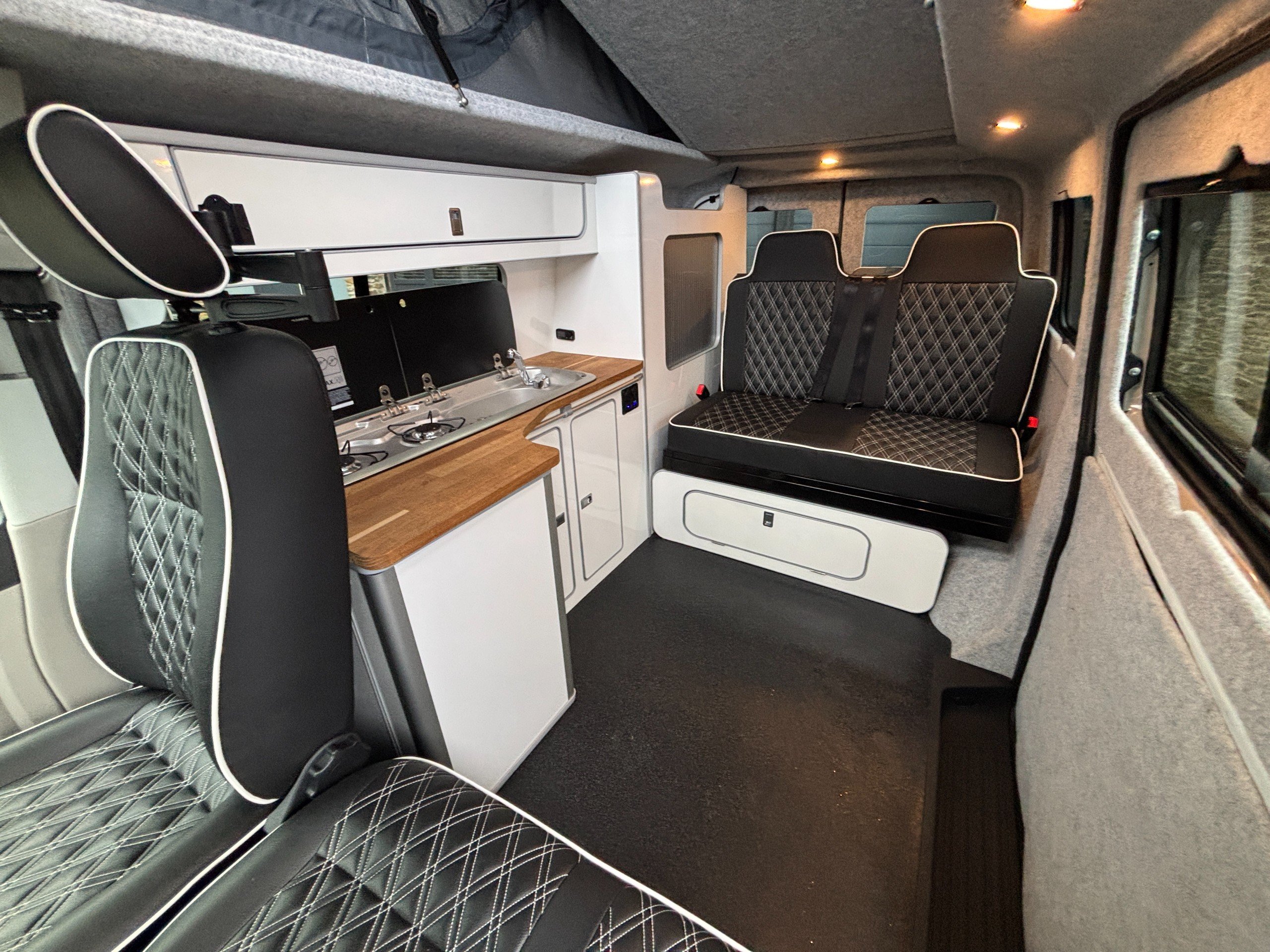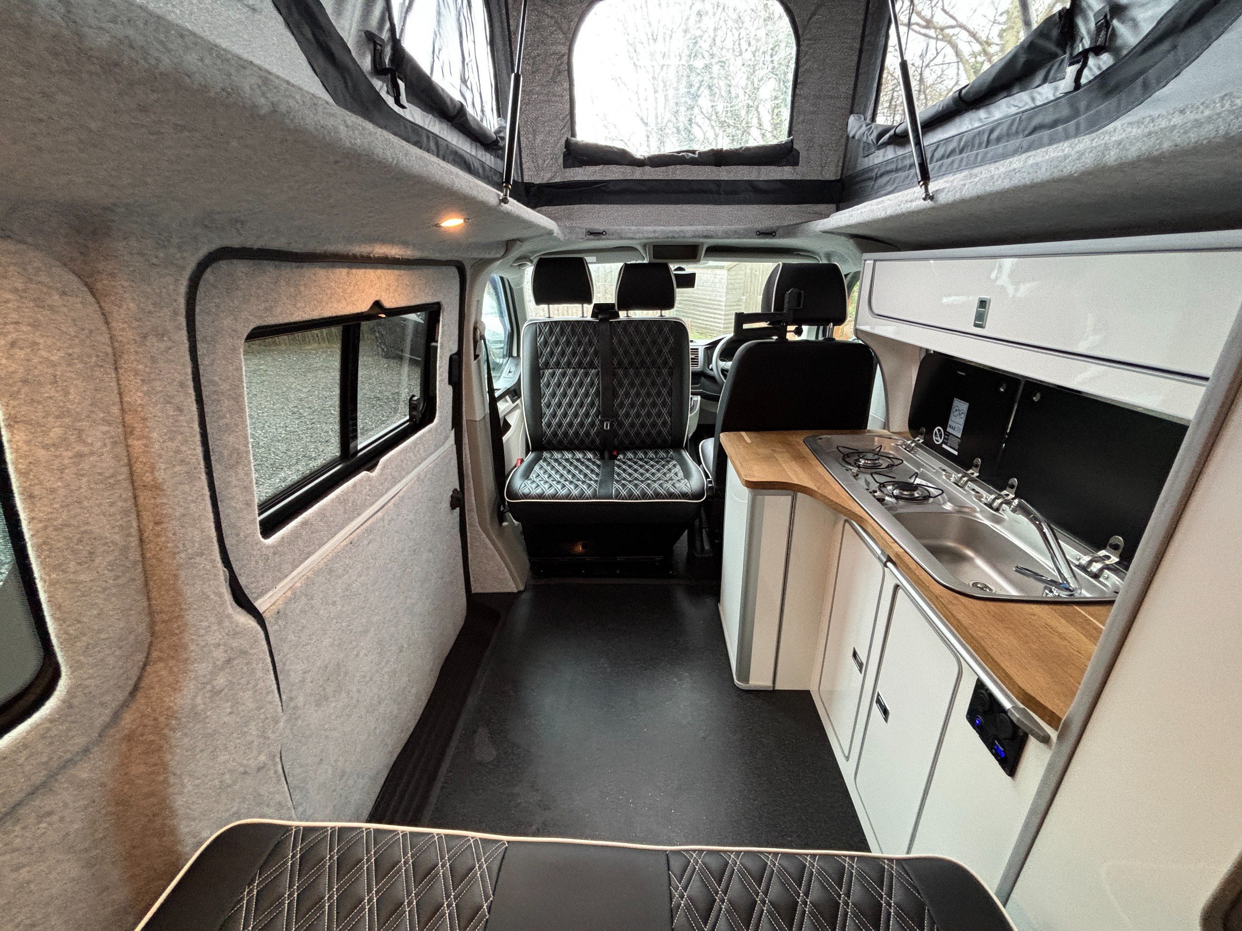 A popular side kitchen conversion, well-appointed with a 2-Burner Hob, Fridge and Sink. Sleeping arrangements include an easy-to-use Rock and Roll bed at the rear and additional sleeping space in the elevating roof.