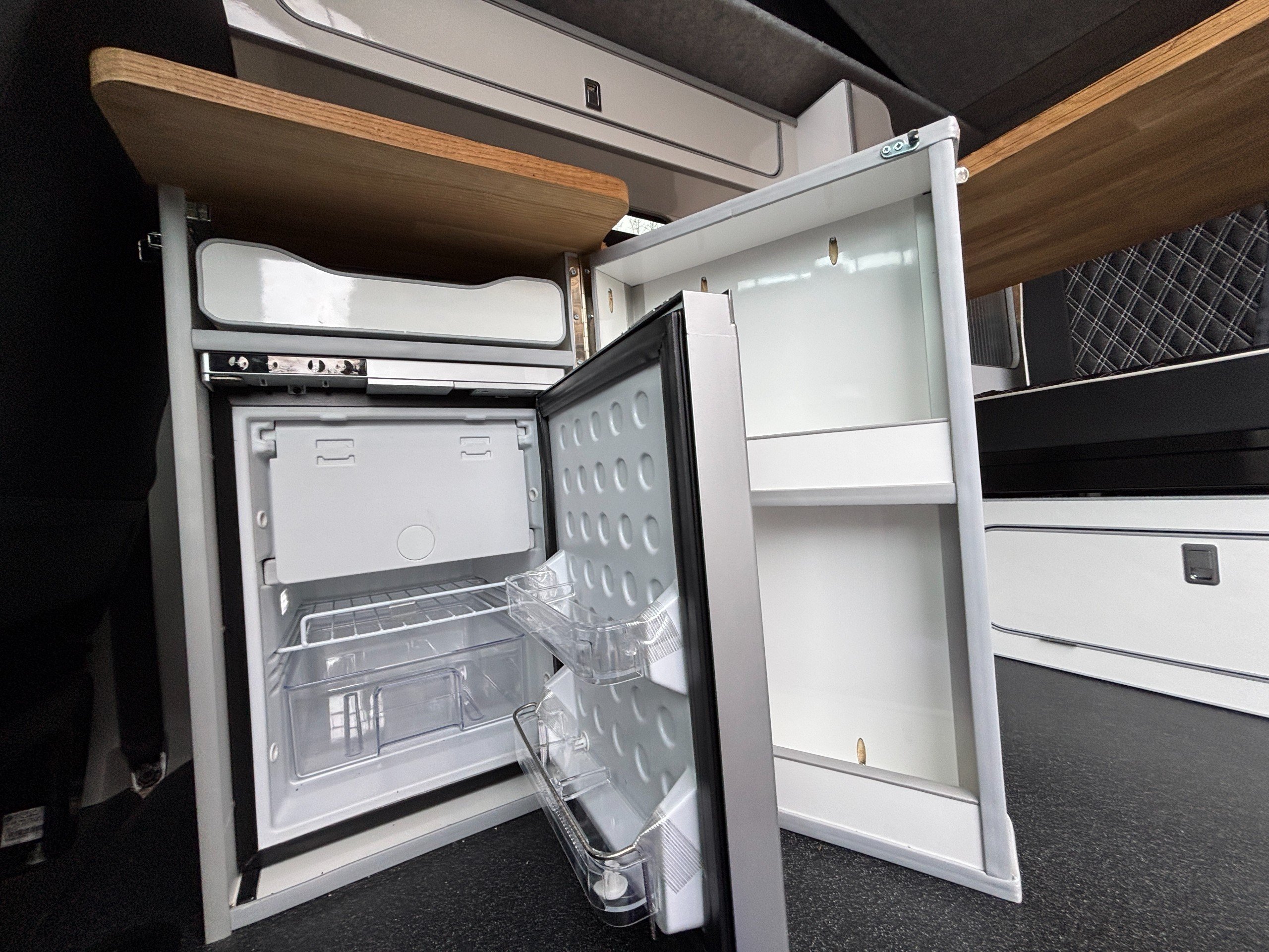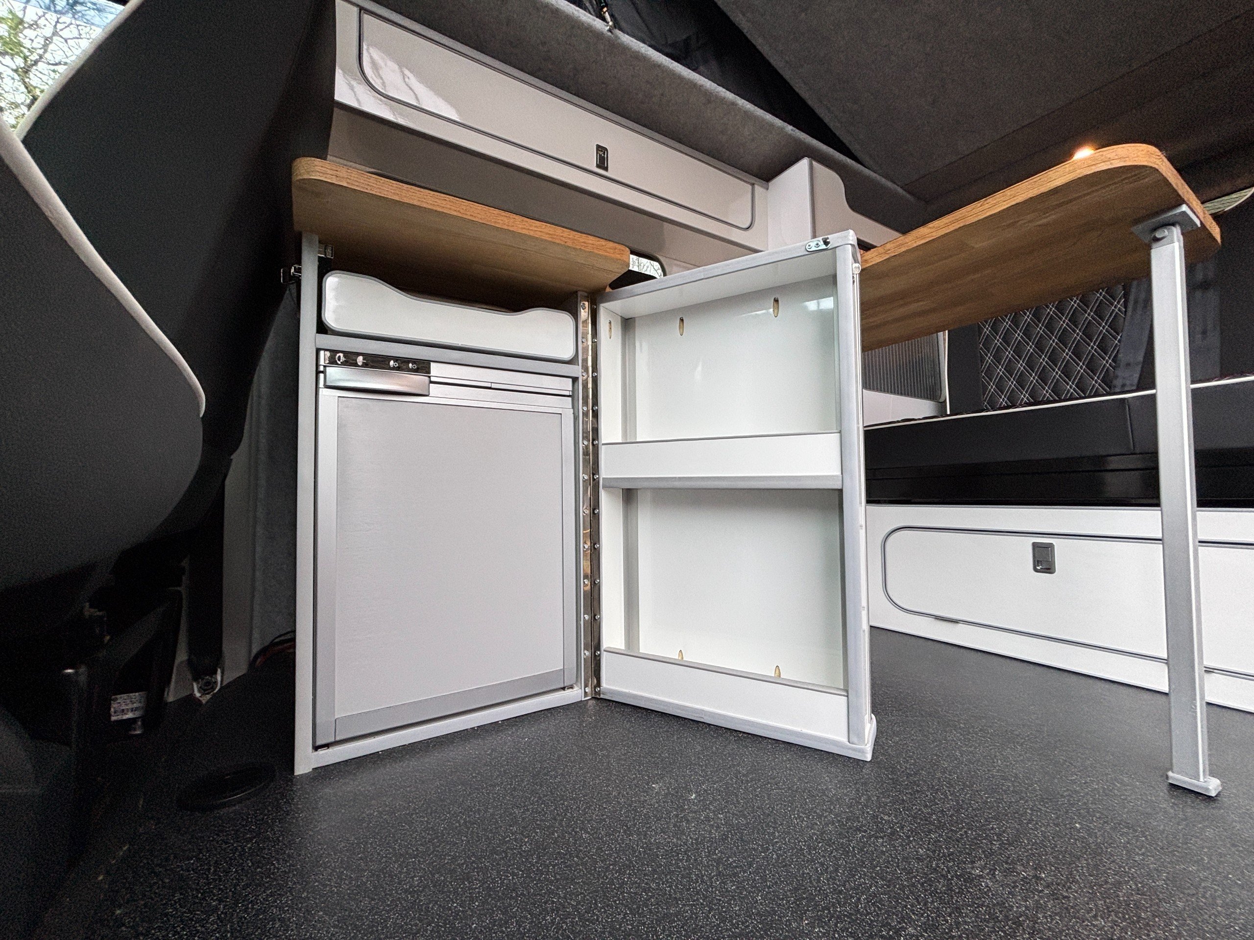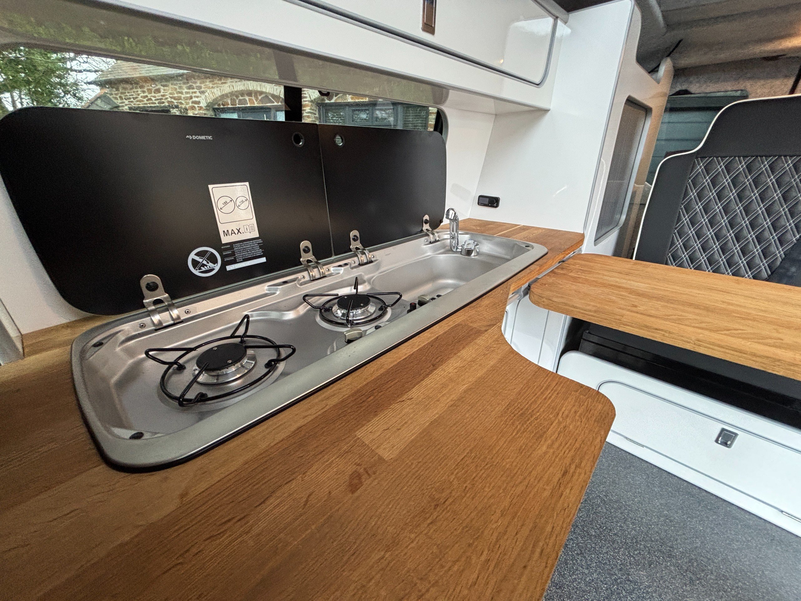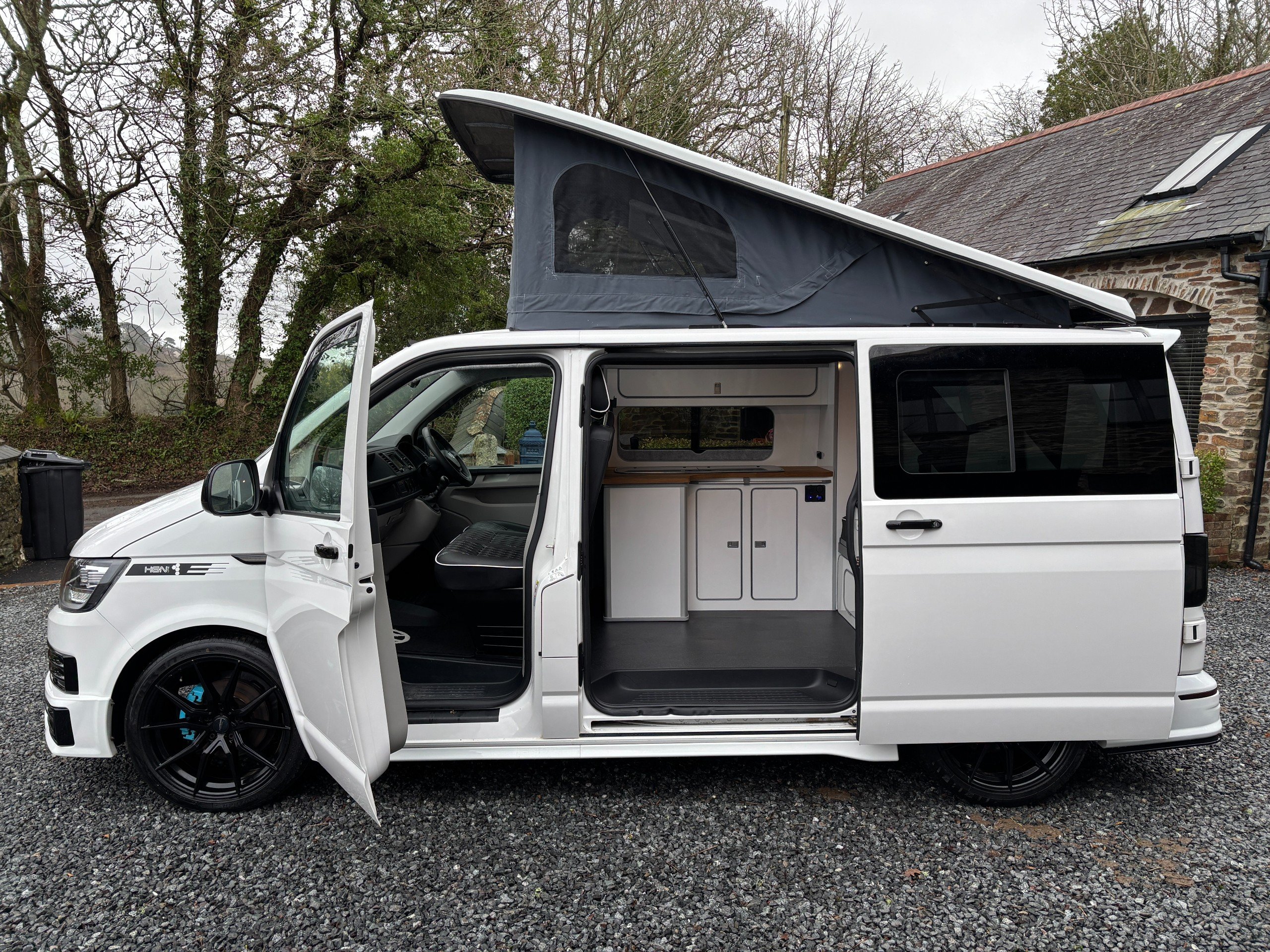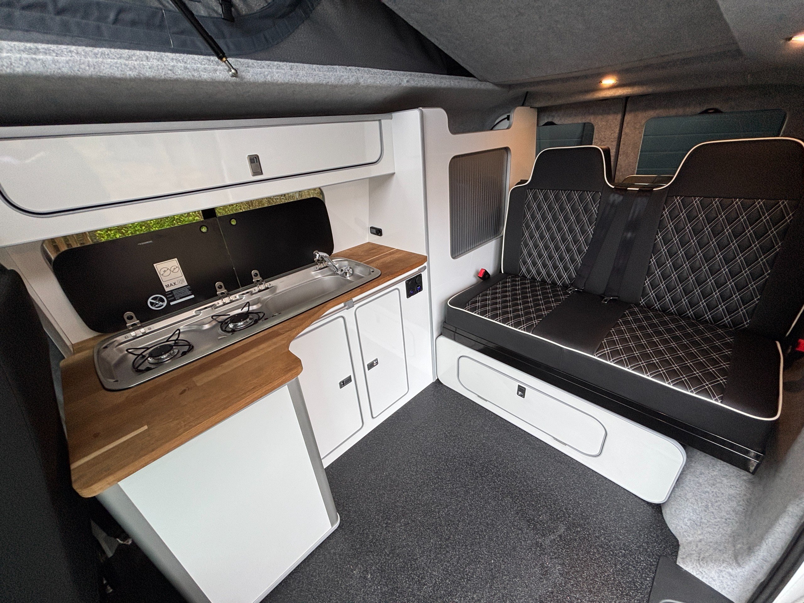 A popular side kitchen conversion, well-appointed with a 2-Burner Hob, Fridge and Sink. Sleeping arrangements include an easy-to-use Rock and Roll bed at the rear and additional sleeping space in the elevating roof.