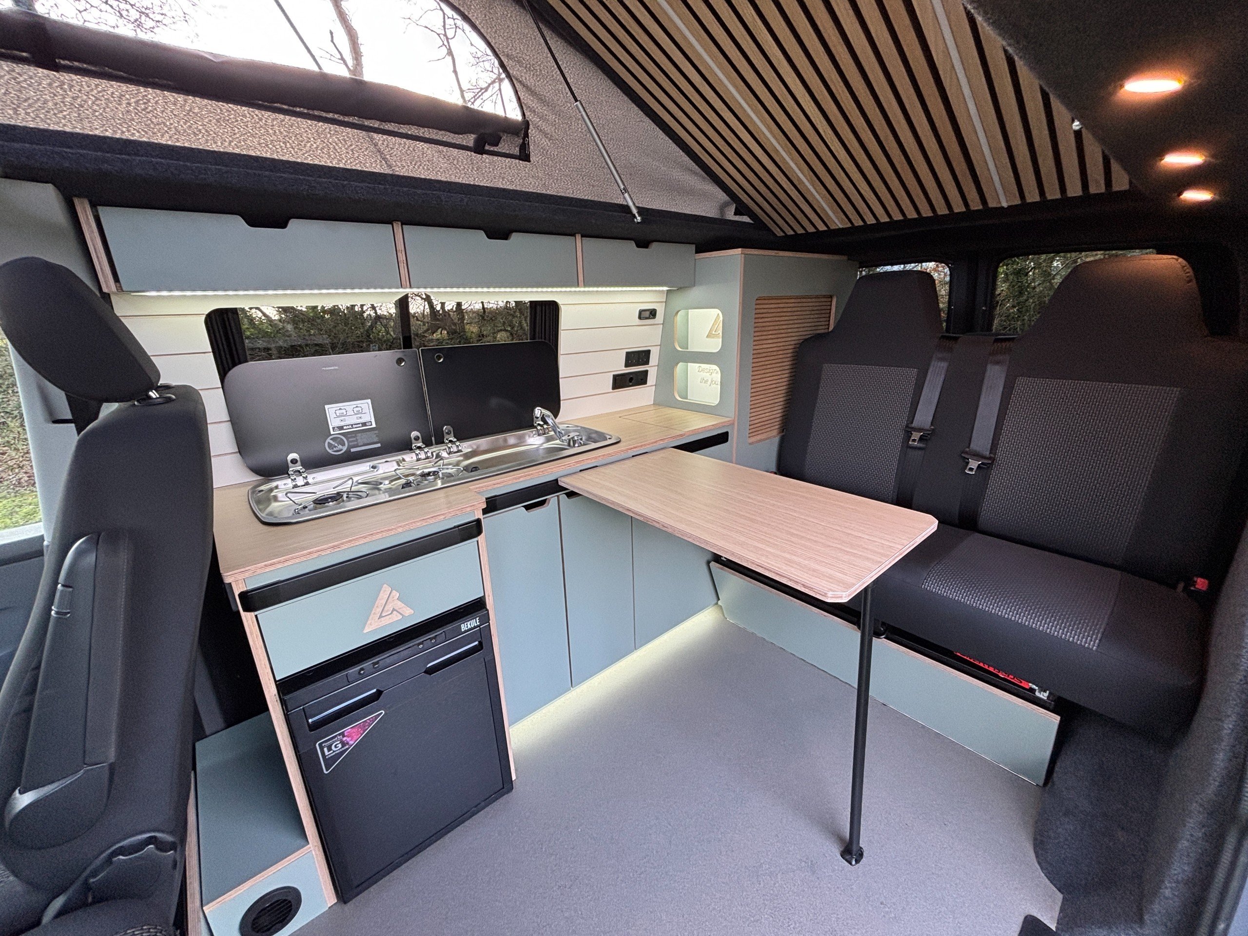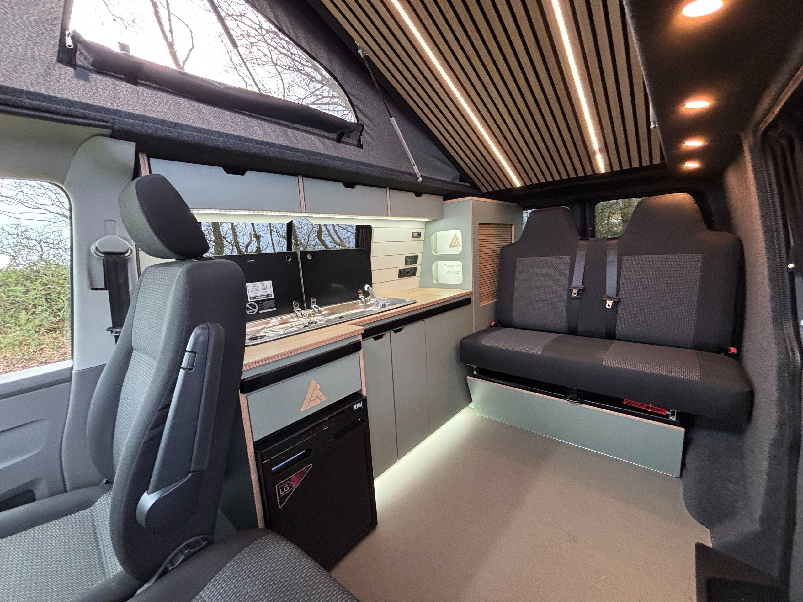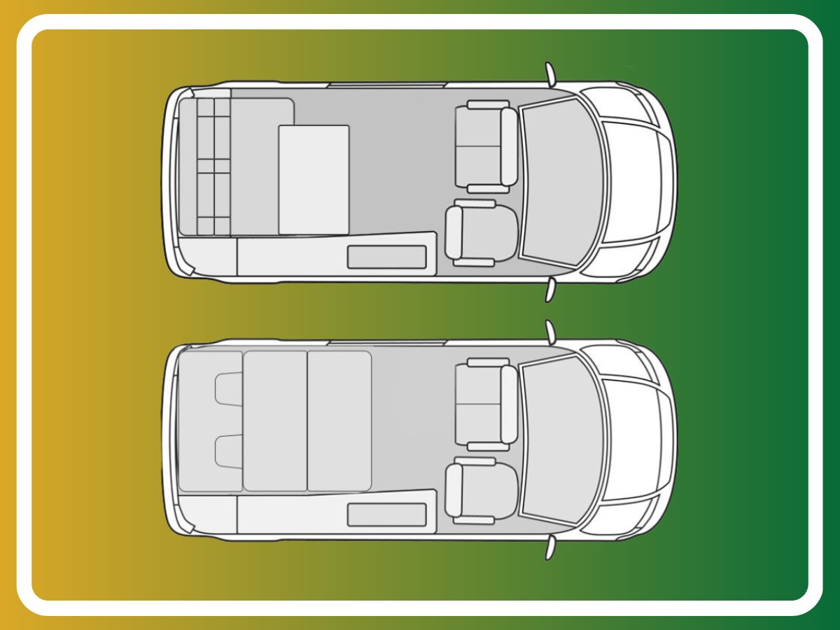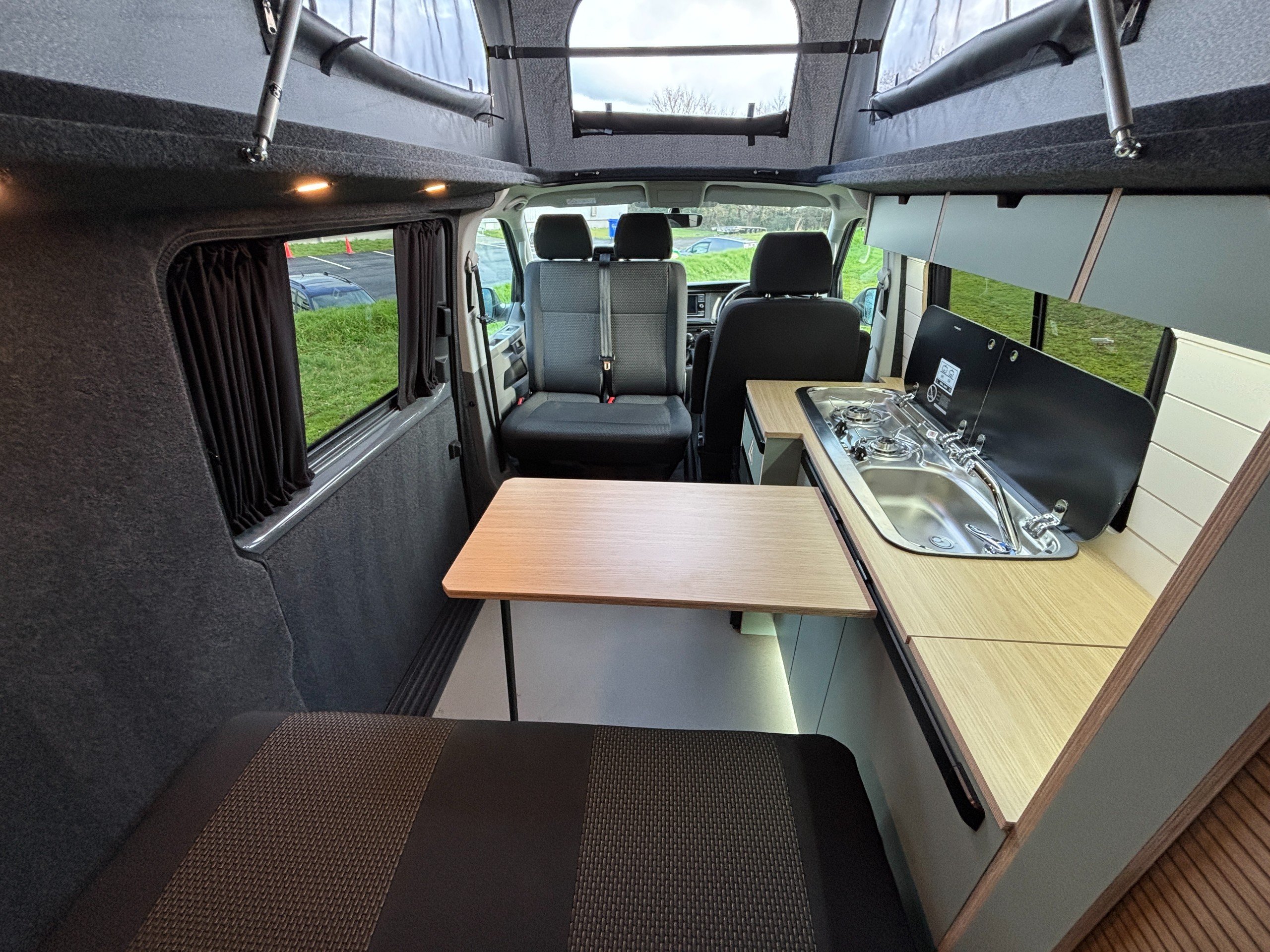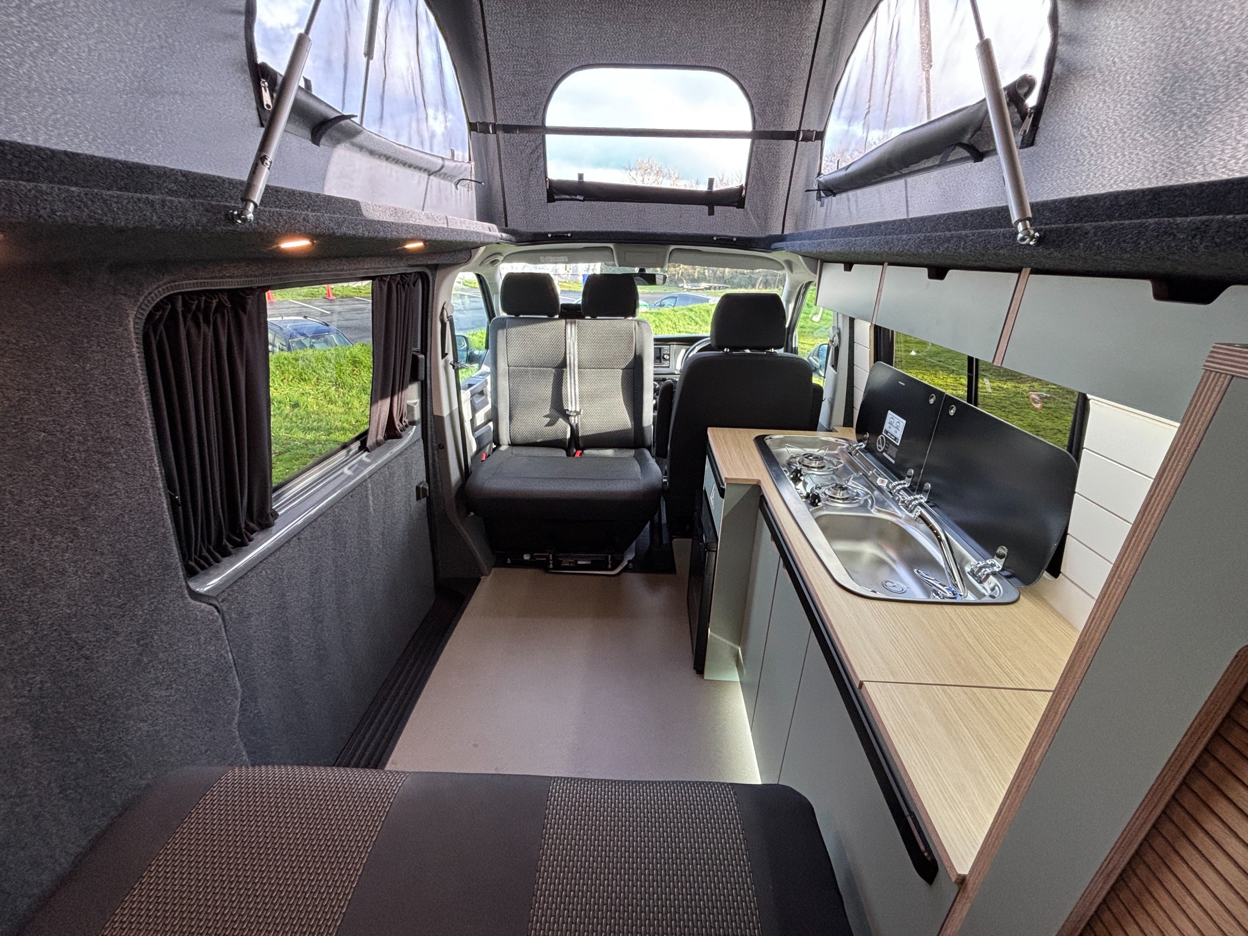 The popular side kitchen conversion features a 2 Burner Hob, Fridge Freezer, along with a quality rock and roll bed, that effortlessly converts into a comfortable double, with additional sleeping above in the elevating roof. Heating is provided by a reliable Autoterm diesel heater.