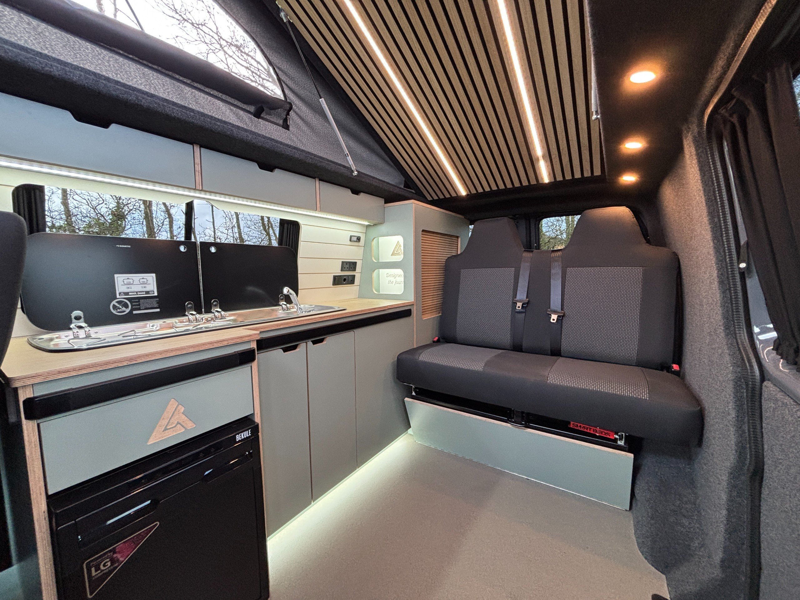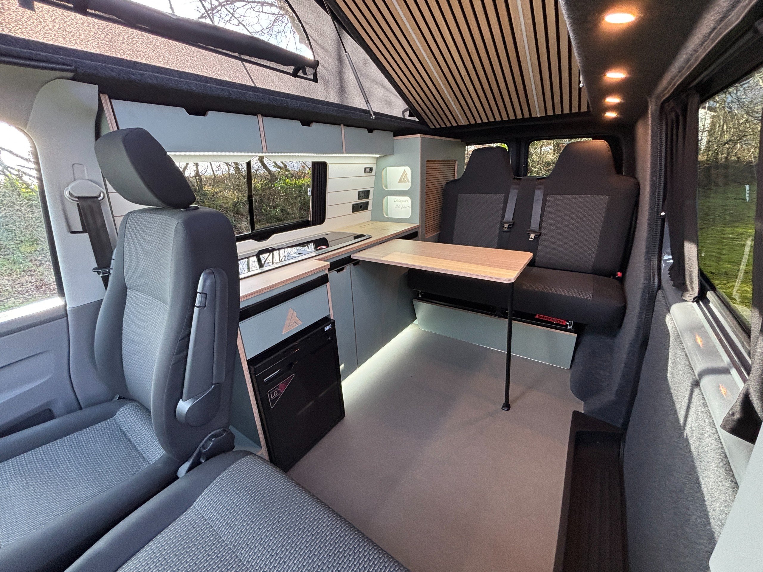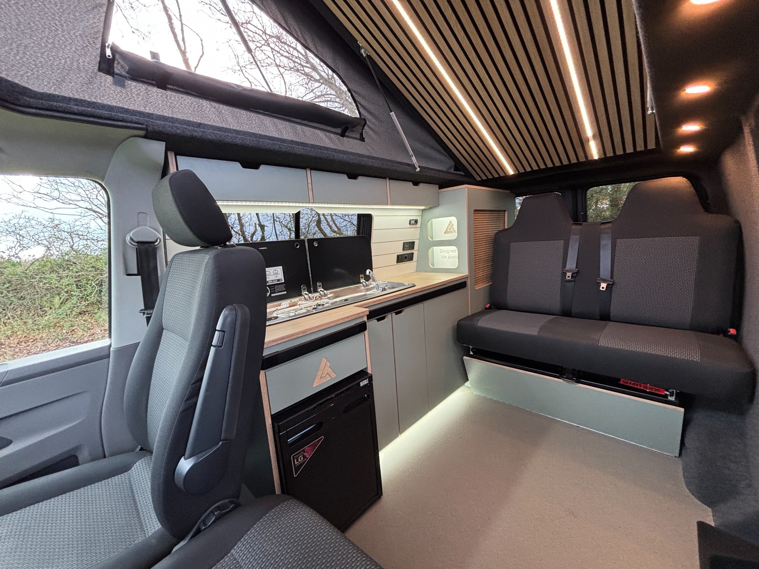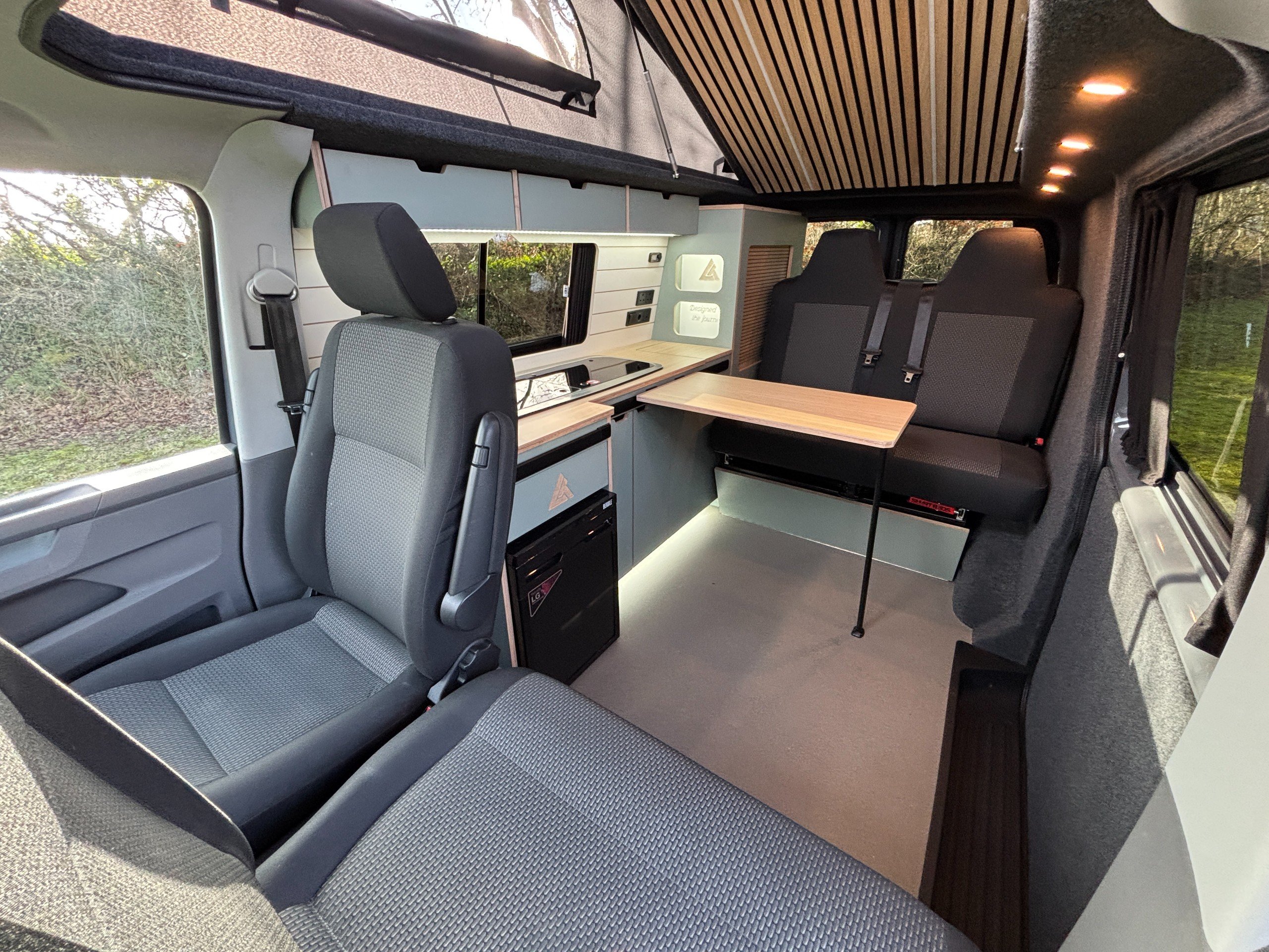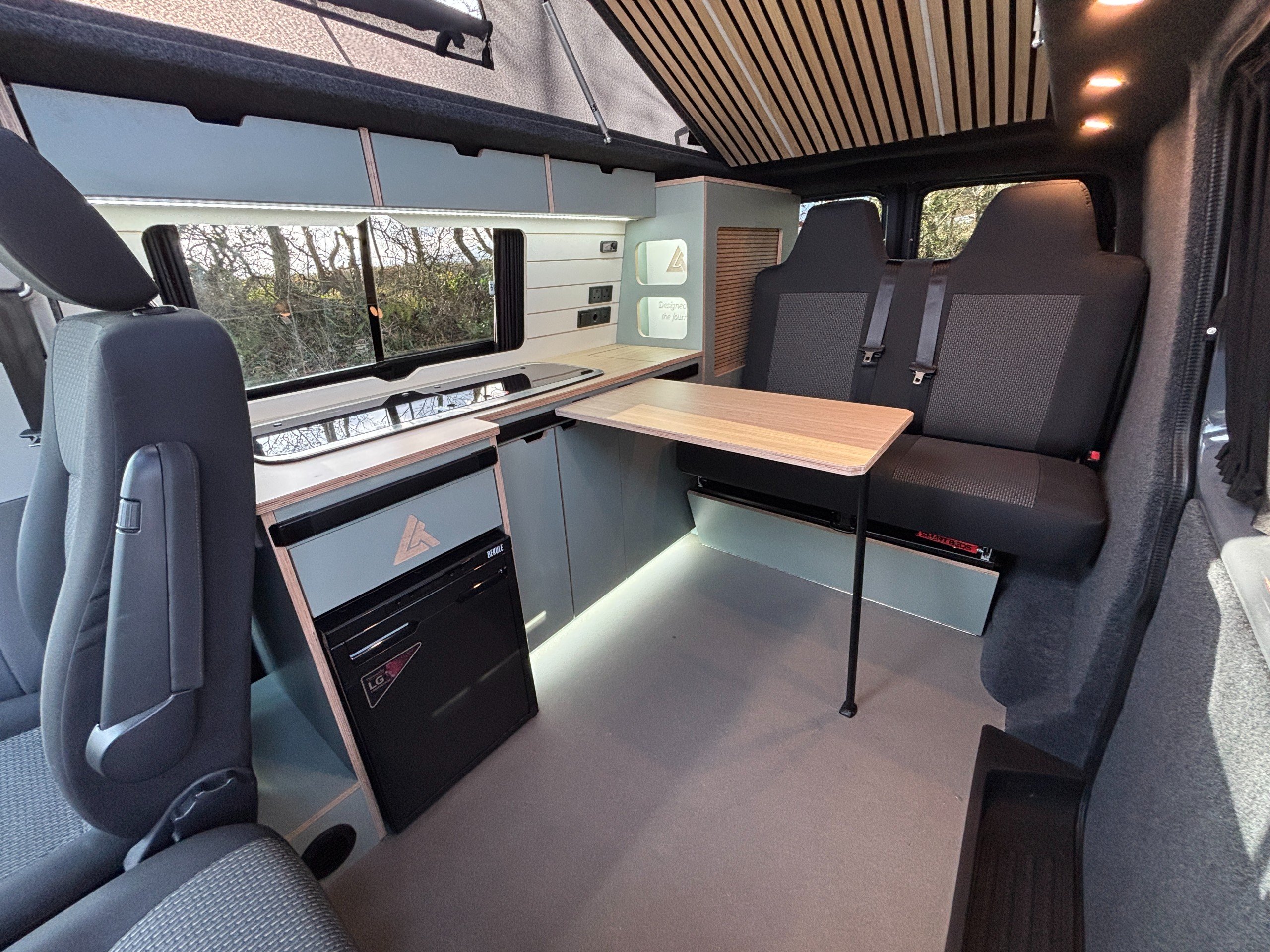 The popular side kitchen conversion features a 2 Burner Hob, Fridge Freezer, along with a quality rock and roll bed, that effortlessly converts into a comfortable double, with additional sleeping above in the elevating roof. Heating is provided by a reliable Autoterm diesel heater.