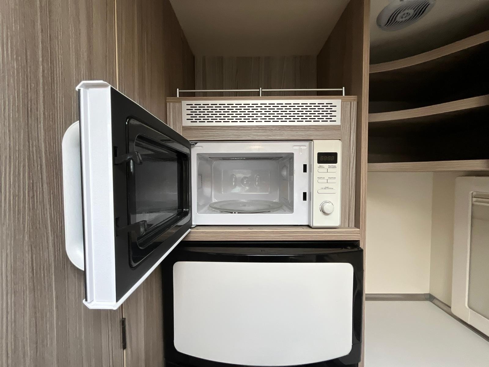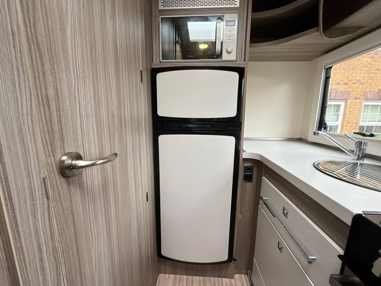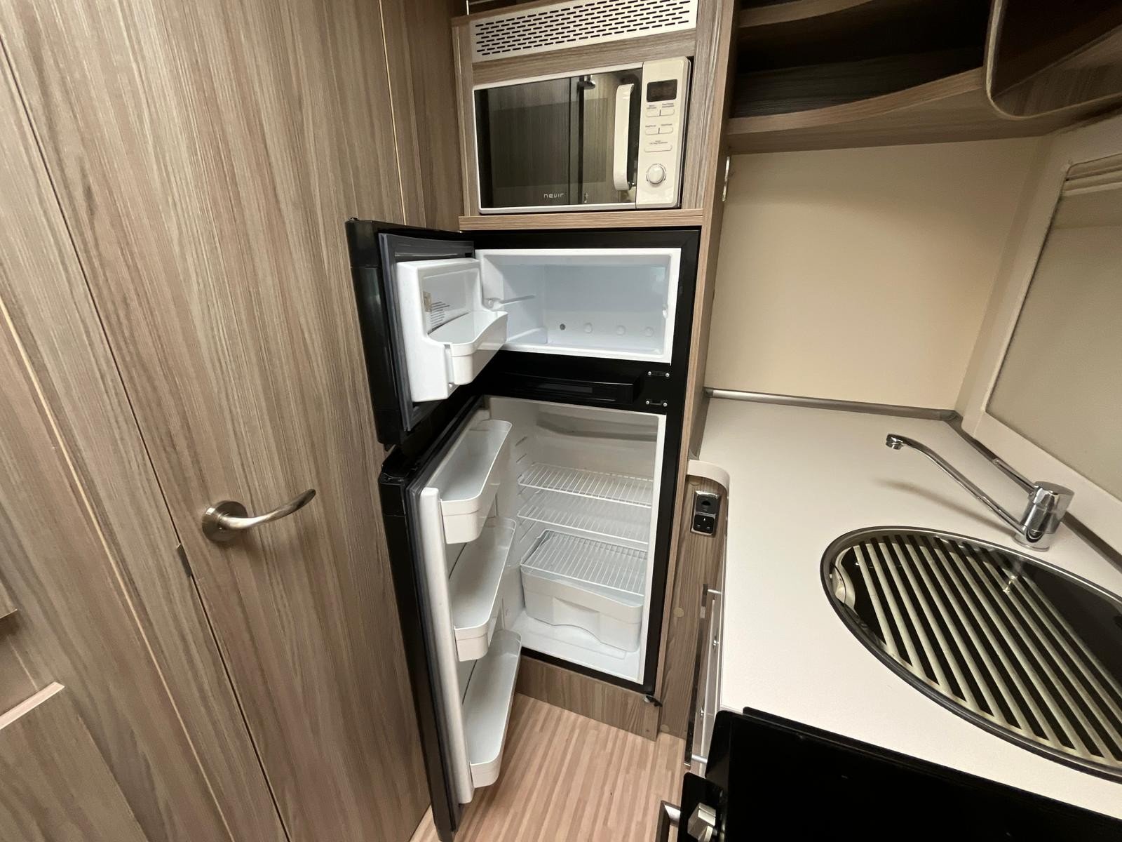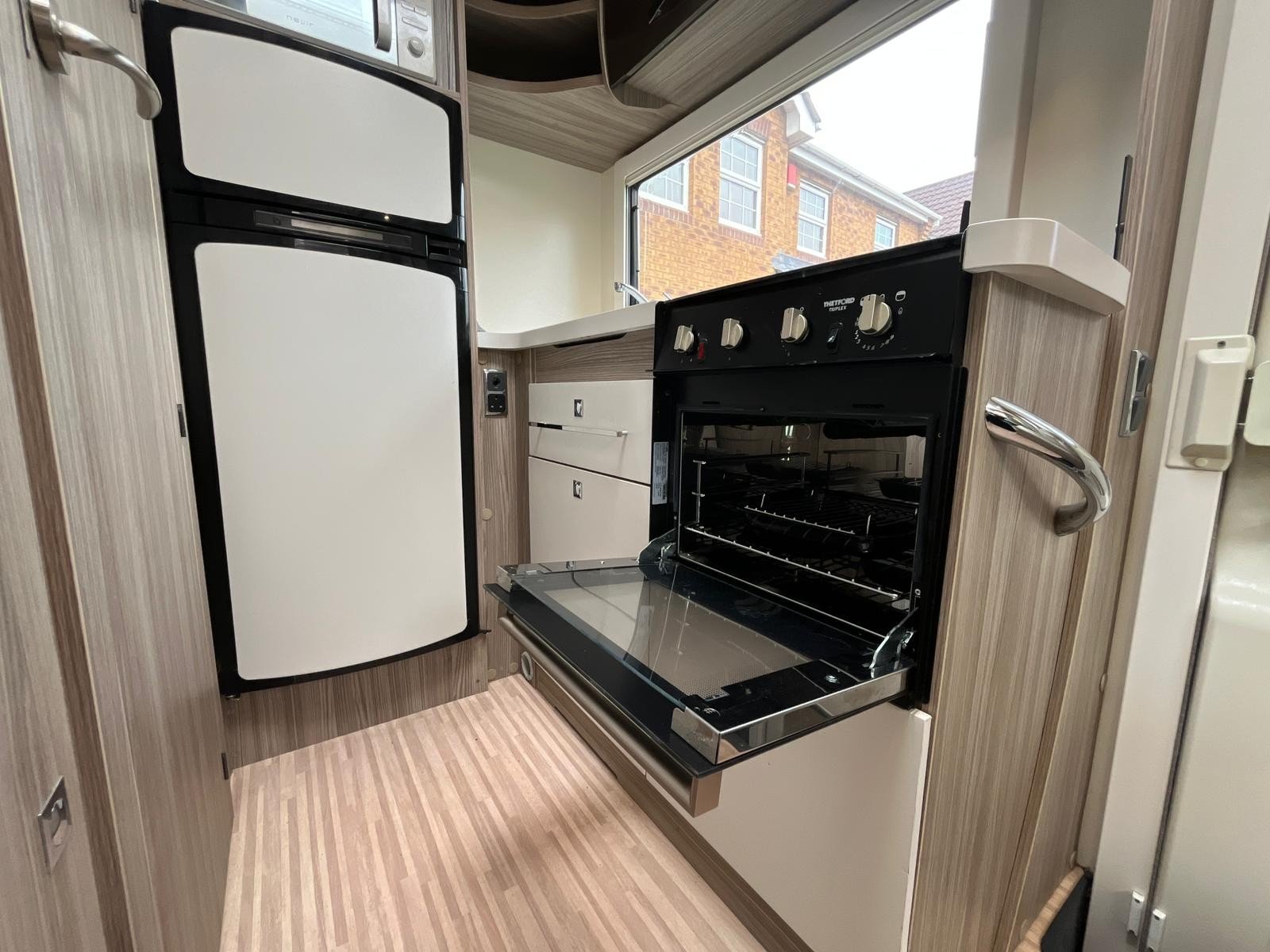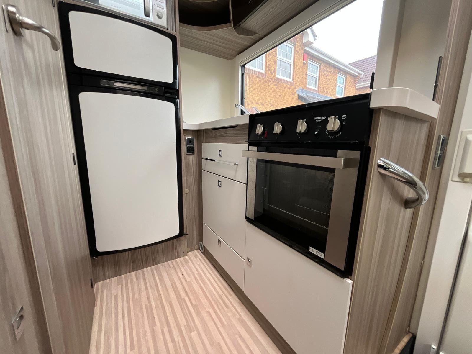 At rear your fully equipped kitchen consisting of large Fridge Freezer, Cooker, Sink and Microwave Oven all with an amazing amount of workspace and storage.