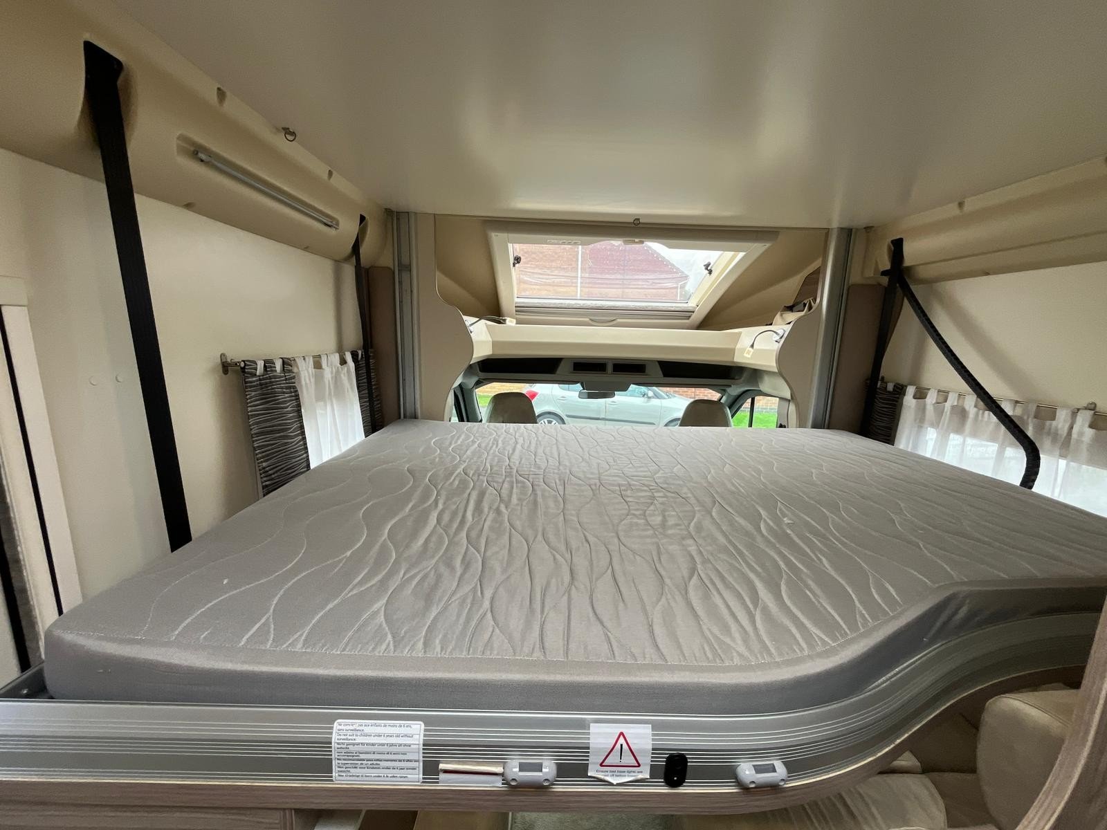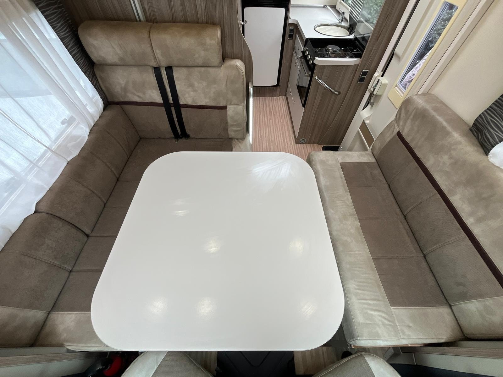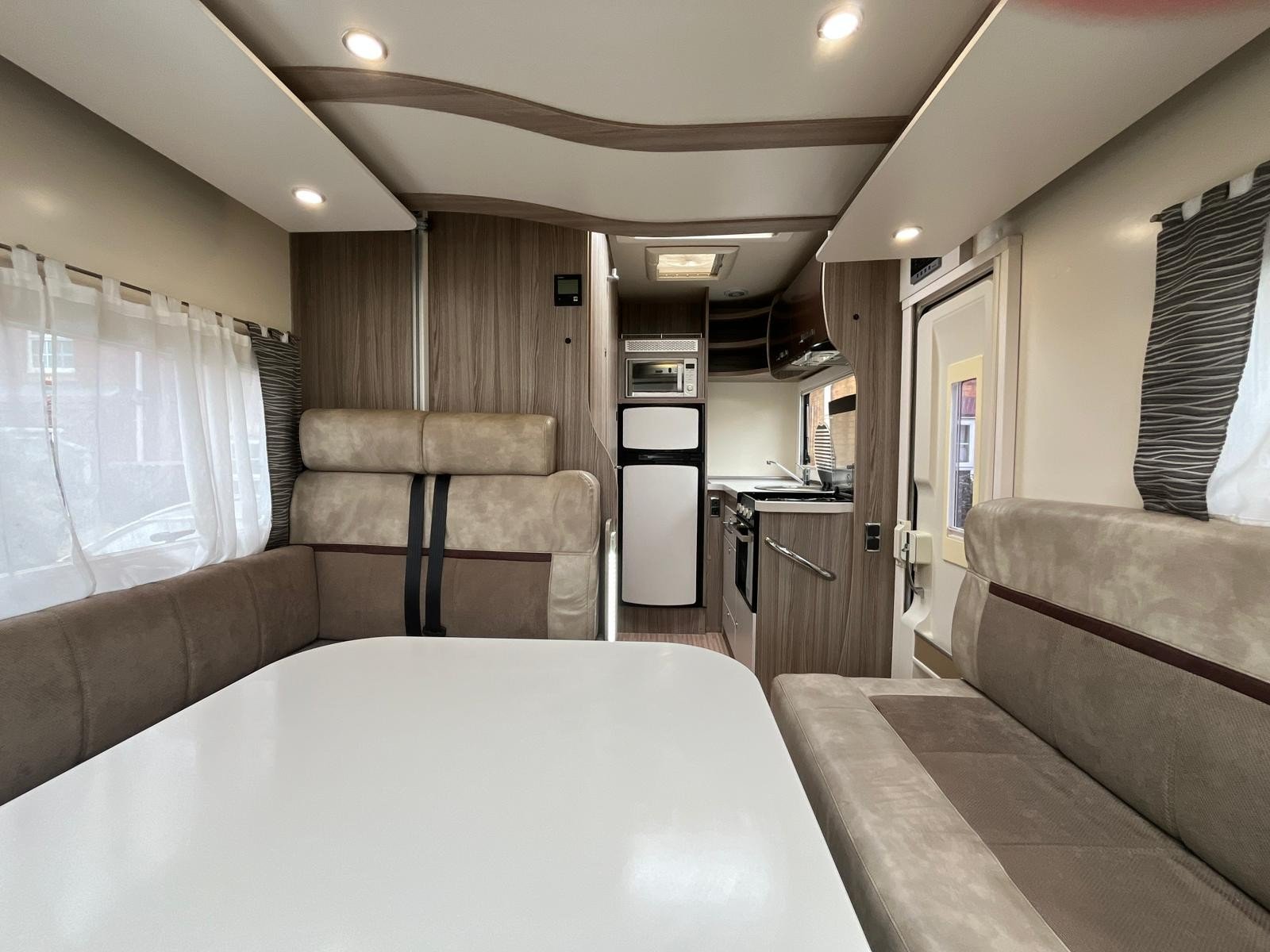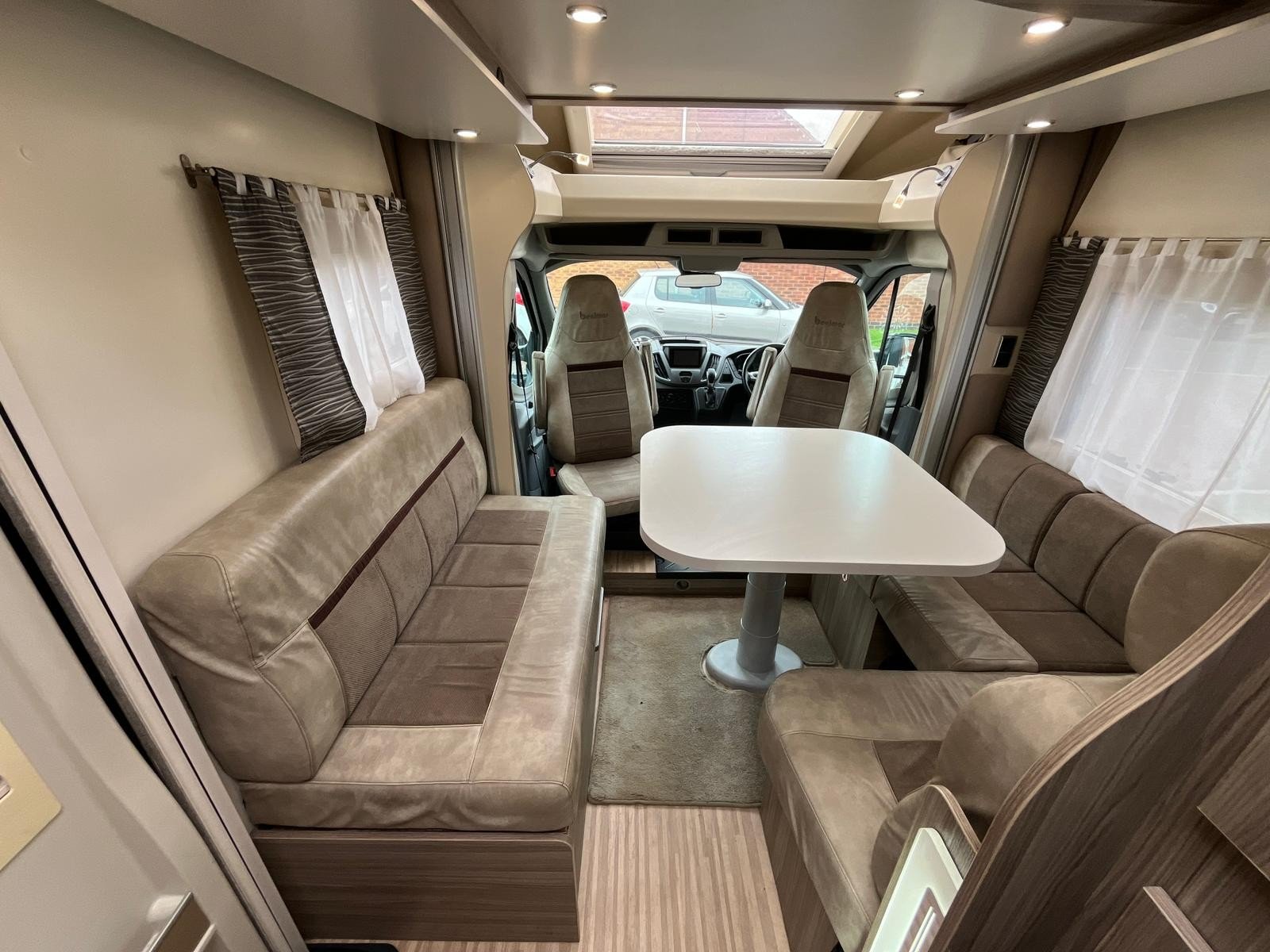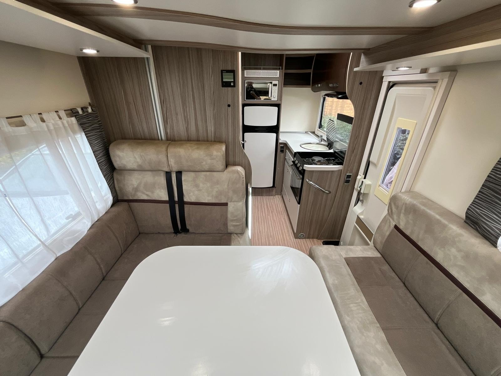 Both driver and cab seats swivel into the living area, here you will find a great lounge space and two travel seats. This area converts into the first of two double beds, with the second being a space saving drop down bed.